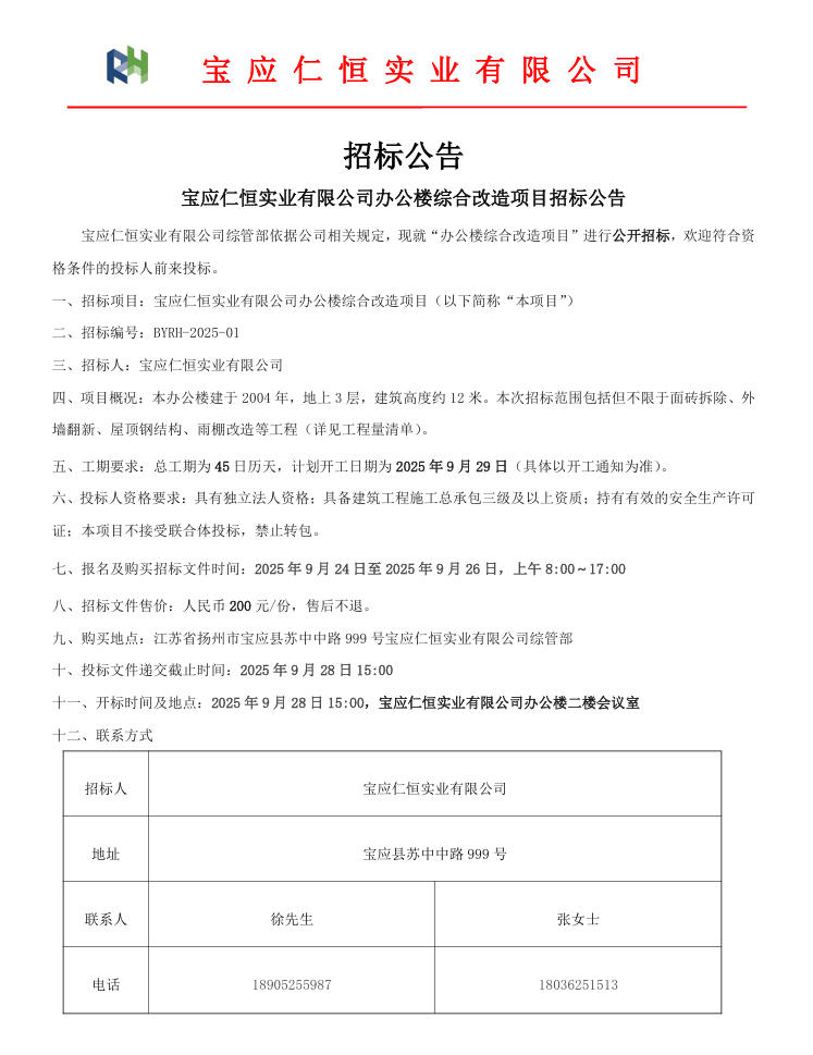宝应仁恒实业有限公司办公楼综合改造项目公开招标公告