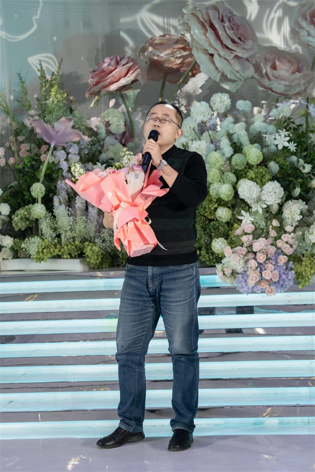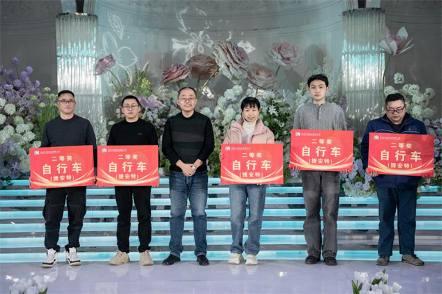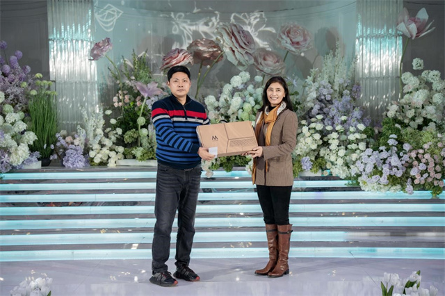 万众期待中,董事长开启了特等奖的抽奖环节。幸运儿揭晓后,现场掌声欢呼不断。董事长为获奖者颁发奖品,并与他合影留念,定格下这一荣耀时刻。